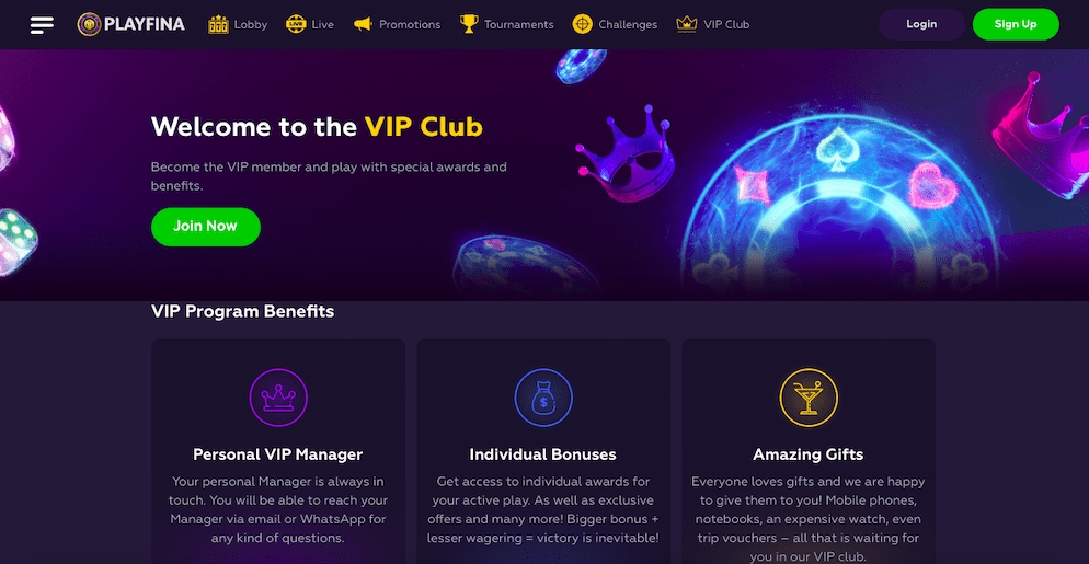 Experience the VIP treatment at Playfina Online Casino and elevate your online gaming experience to new heights! Sign up today and start enjoying the exclusive perks of our VIP program.